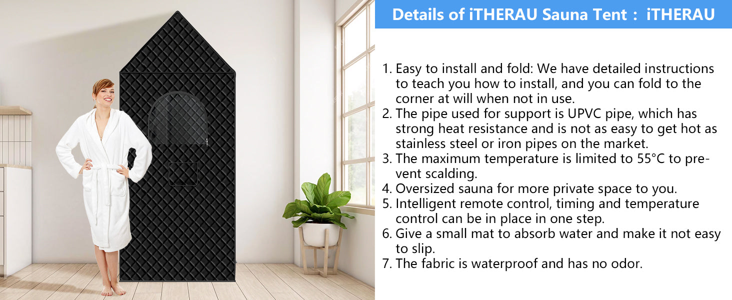 Various Scenes: Suitable for all kinds of scenes, including bedrooms, living rooms, bathrooms, and gyms. You can easily move it to any place and fold it for storage. With this portable sauna, you can enjoy a sauna at home anytime and anywhere.