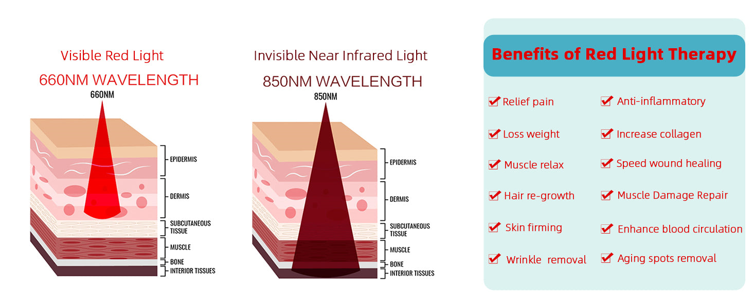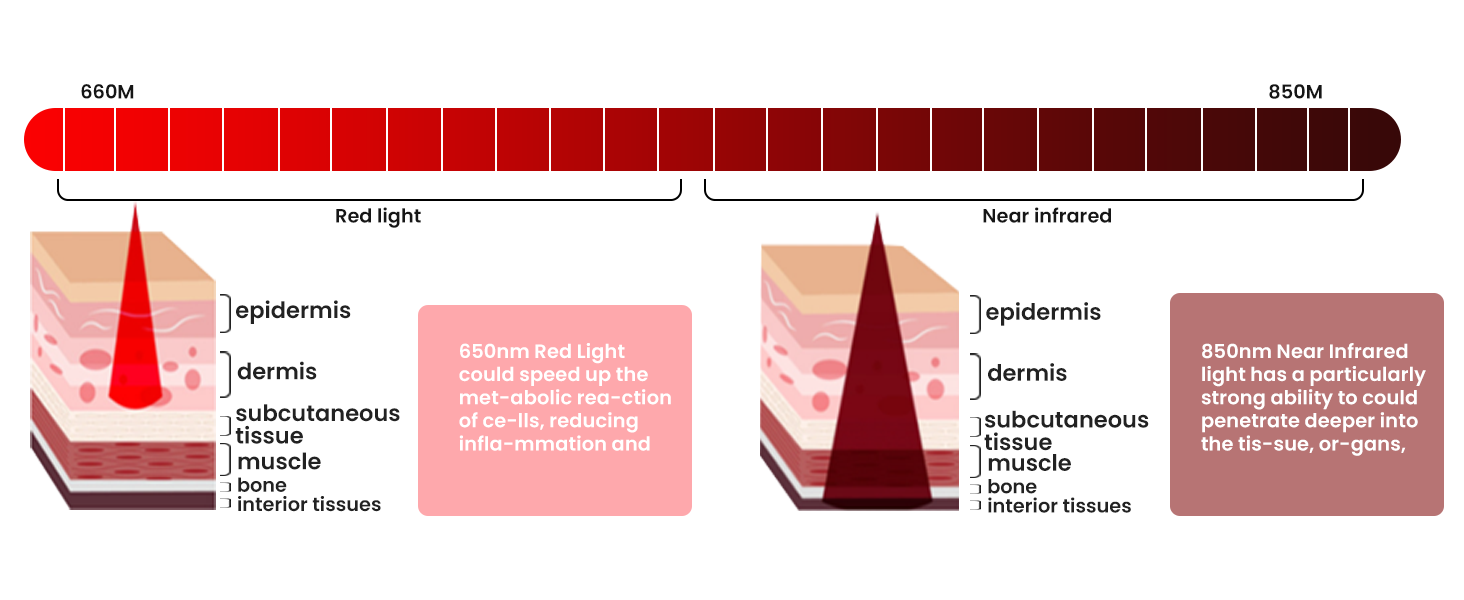 - 660nm wavelength red light (visible) is effectively absorbed by the skin, promoting collagen production and accelerating wound healing.