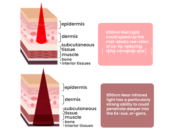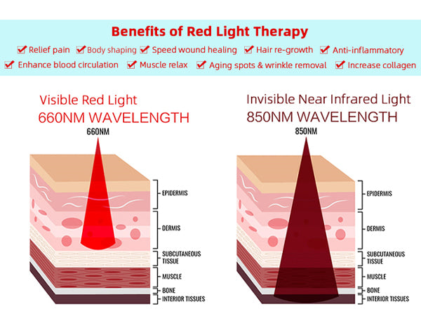- 850nm wavelength near infrared light (invisible) penetrates deeper to reach your bones, tissues, organs and joints, enhancing muscle recovery and reducing inflammation and joint pain.