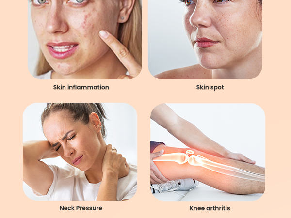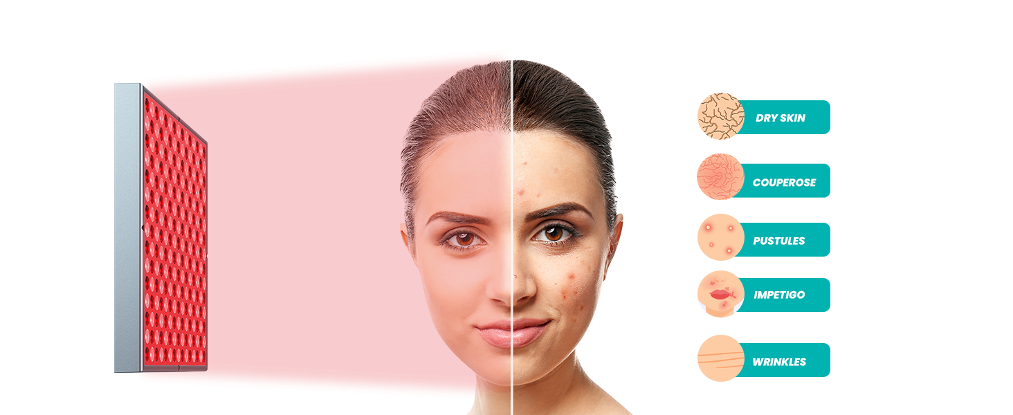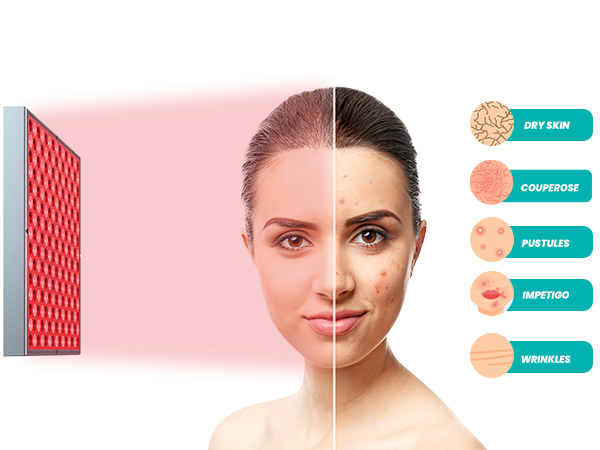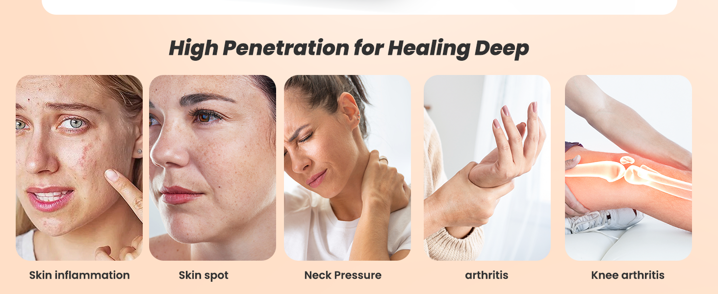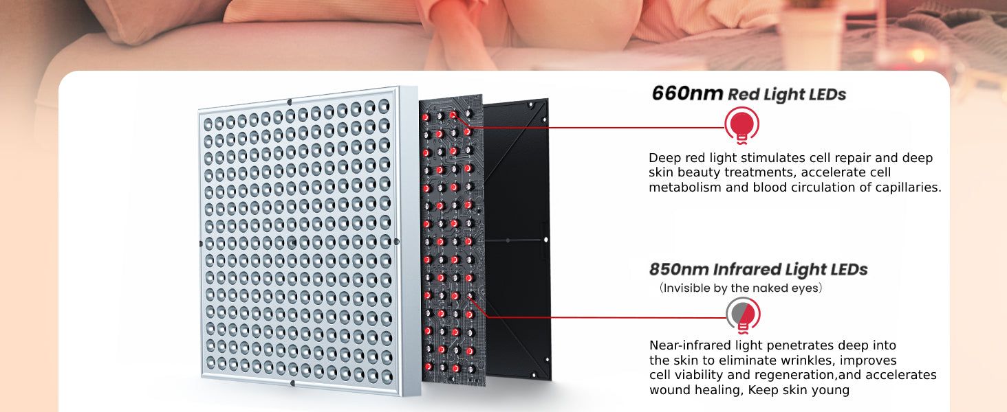 - 660nm wavelength red light (visible) is effectively absorbed by the skin, promoting collagen production and accelerating wound healing.